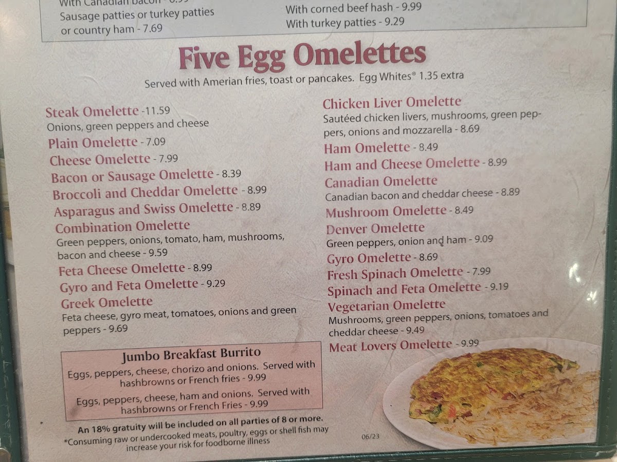 Fggs, peppers, cheese, chorizo and onions. Served with hashbrowns or french fries